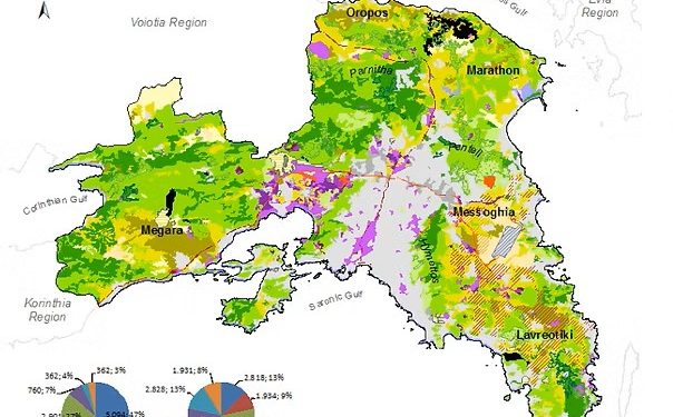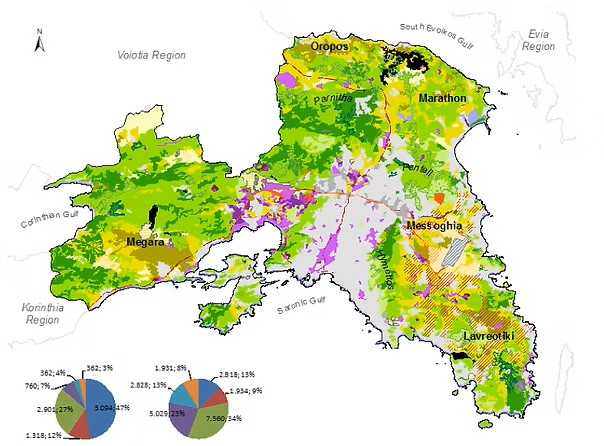 Παρά τη γενική παρακμή του πρωτογενούς τομέα με την πάροδο των ετών, η περιαστική γεωργία εξακολουθεί να προσφέρει σημαντικά πλεονεκτήματα και ευκαιρίες απασχόλησης, ιδίως σε περιόδους οικονομικής αστάθειας. Σύμφωνα με τα εθνικά στατιστικά στοιχεία για το 2017, η συνολική καλλιεργούμενη γεωργική γη στην περιφέρεια Αττικής ήταν 41.315 εκτάρια, με 2.292 εκτάρια αγρανάπαυσης. Οι παραγωγικοί μετασχηματισμοί της αγρανάπαυσης, ιδίως σε πιο προσβάσιμες αγροτικές περιοχές κατά τη διάρκεια κρίσεων, οδήγησαν σε αύξηση των δενδρωδών καλλιεργειών, συμπεριλαμβανομένων των αμπελιών και των ελιών. Σχεδόν το ήμισυ της υφιστάμενης περιφερειακής γεωργικής γης καλύπτεται κυρίως από δενδροκαλλιέργειες (20.077 εκτάρια), με το 14% να αφιερώνεται σε αμπέλια και μόνο το 8% σε καλλιέργεια λαχανικών.