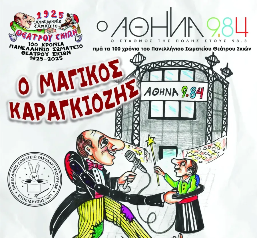 Ο Αθήνα 9.84 τιμά τα 100 χρόνια του Πανελλήνιου Σωματείου Θεάτρου Σκιών με ένα πολυθέαμα για μικρούς και μεγάλους. Στην Τεχνόπολη του Δήμου Αθηναίων θα πραγματοποιηθεί το διήμερο παραστάσεων Καραγκιόζη και Ταχυδακτυλουργού. Στην εκδήλωση συμμετέχει και το Πανελλήνιο Σωματείο Ταχυδακτυλουργών.