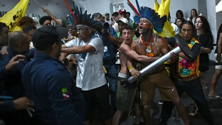 Χθες το βράδυ αυτόχθονες και υποστηρικτές τους ολοκλήρωσαν πορεία για το κλίμα και την υγεία και άρχισαν να χορεύουν μπροστά στην είσοδο του χώρου όπου διεξάγεται η COP30, στην Μπελέμ, πόλη στο βραζιλιάνο τμήμα του δάσους του Αμαζονίου. Κατόπιν μπήκαν στον χώρο, προτού το προσωπικό ασφαλείας τους απωθήσει βίαια, κάτι στο οποίο ορισμένοι πρόβαλαν αντίσταση.