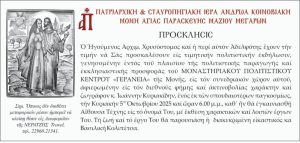 στην Ιερά Μονή Αγίας Παρασκευής Μαζίου Μεγάρων, θα εγκαινιασθεί έκθεση