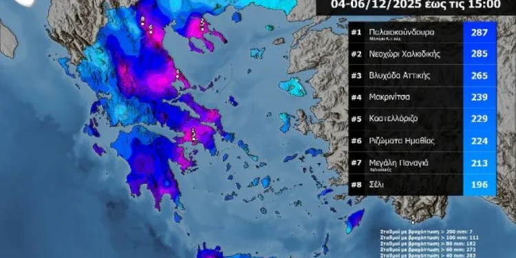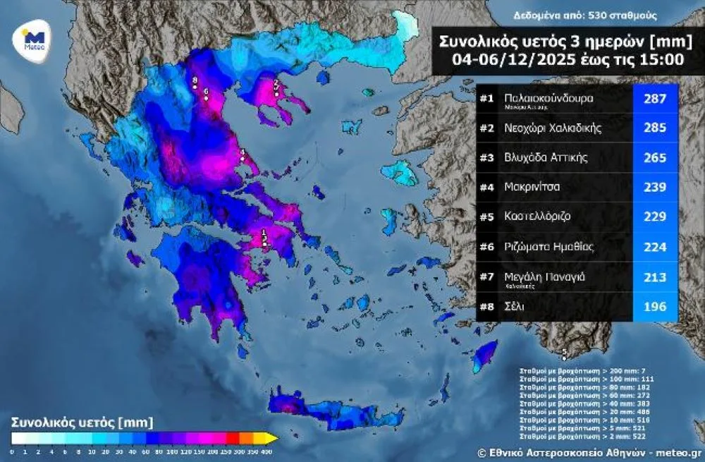 Όπως φαίνεται χαρακτηριστικά στον ανανεωμένο χάρτη (μέχρι και τις 15:00 του Σαββάτου 06/12/2025), σύμφωνα με το δίκτυο σταθμών του meteo.gr / Εθνικού Αστεροσκοπείου Αθηνών, το ύψος βροχής ξεπέρασε τα 100 χιλιοστά σε 111 σταθμούς, τα 80 χιλιοστά σε 182 σταθμούς και τα 60 χιλιοστά σε 272 σταθμούς. Επιπλέον, 7 σταθμοί, κατέγραψαν πάνω από 200 χιλιοστά, μέσα σε αυτούς η Βλυχάδα Αττικής με 265 χιλιοστά βροχής.