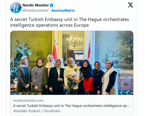 Ένα απόρρητο δίκτυο συλλογής πληροφοριών που λειτουργούσε εντός της τουρκικής πρεσβείας στη Χάγη αποκαλύφθηκε, σύμφωνα με συλλογή διαβαθμισμένων εγγράφων που απέκτησε και δημοσιοποίησε το Nordic Monitor. Η μυστική μονάδα είχε ως στόχο τη συστηματική παρακολούθηση και καταγραφή του προφίλ δημοσιογράφων, αντιφρονούντων και επικριτών του Τούρκου προέδρου Ρετζέπ Ταγίπ Ερντογάν σε όλη την Ευρώπη. Η αποκάλυψη αναδεικνύει «ένα ακόμη επίπεδο της ολοένα και πιο επιθετικής εκστρατείας διεθνικής καταστολής της Άγκυρας», η οποία «καταχράται την διπλωματική ασυλία και χρησιμοποιεί τους κρατικούς θεσμούς ως όπλα» αναφέρει το δημοσίευμα.