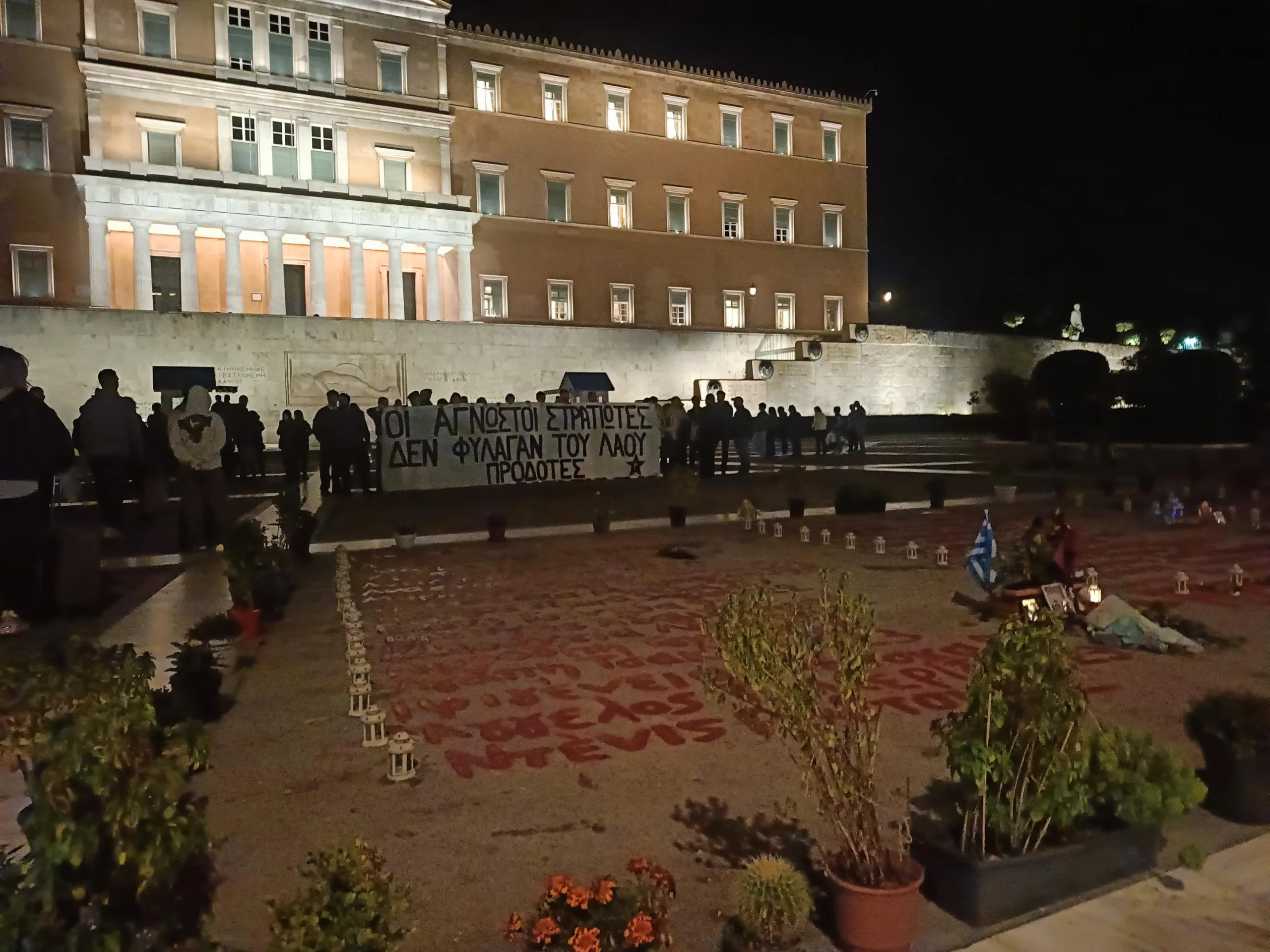 Παρέμβαση στο μνημείο του Άγνωστου Στρατιώτη πραγματοποίησαν αργά το απόγευμα μέλη του Ρουβίκωνα, όπου άπλωσαν πανό με συνθήματα όπως: Οι άγνωστοι στρατιώτες είναι του λαού και δεν φύλαγαν του λαού προδότες.