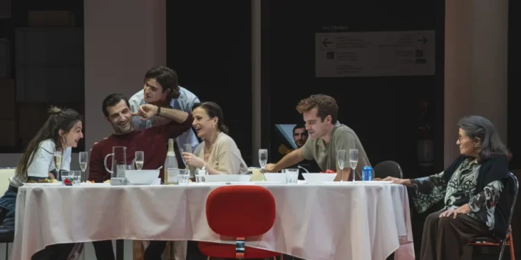 Με τον Νίκο Κουρή και την Καρυοφυλλιά Καραμπέτη στους ρόλους του Οιδίποδα και της Ιοκάστης, τον Λάζαρο Γεωργακόπουλο ως Κρέοντα και τη Ράνια Οικονομίδου ως Μερόπη (ένα πρόσωπο που εισάγει ο Άικ στο έργο) αλλά και τους Κώστα Νικούλι, Σωκράτη Πατσίκα, Τάκη Σακελλαρίου, Χαρά Γιώτα, Γιώργο Ζιάκα, Γιάννη Τσουμαράκη και Δανάη-Αρσενία Φιλίδου να συγκροτούν ένα τραπέζι μιας οικογενειακής και πολιτικής συνάθροισης που εκτρέπεται οριστικά. Σε μετάφραση στα ελληνικά από τον Νίκο Χατζόπουλο, σκηνοθετική επιμέλεια ελληνικής παραγωγής τη Lizzie Manwaring και συνεργάτη σκηνοθέτη για την ελληνική εκδοχή τον Πρόδρομο Τσινικόρη, φορτισμένη με πολιτική, κοινωνική και υπαρξιακή ένταση, μια ηλεκτρισμένη εκδοχή του μύθου του Οιδίποδα.