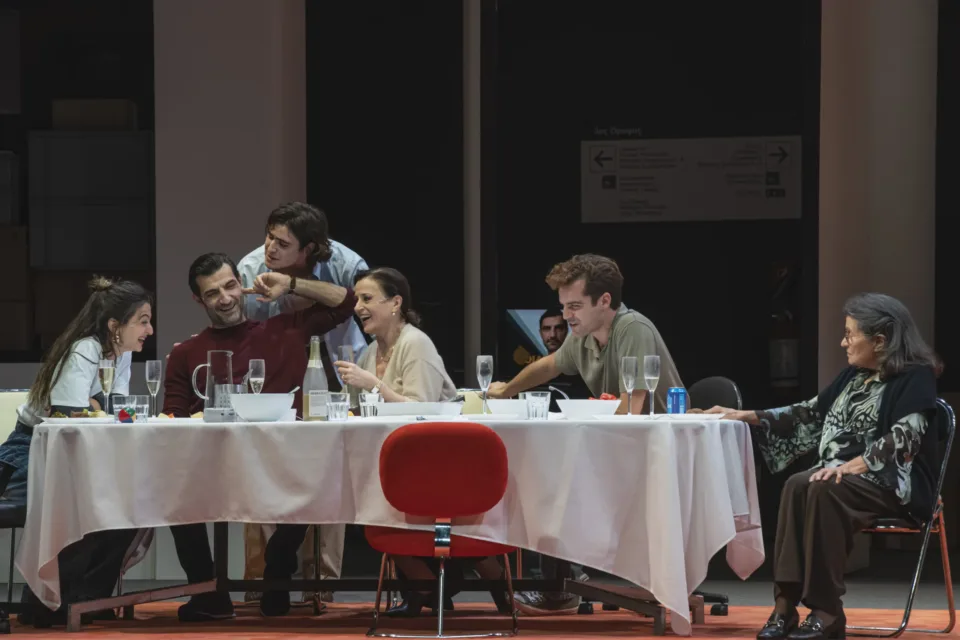 Με τον Νίκο Κουρή και την Καρυοφυλλιά Καραμπέτη στους ρόλους του Οιδίποδα και της Ιοκάστης, τον Λάζαρο Γεωργακόπουλο ως Κρέοντα και τη Ράνια Οικονομίδου ως Μερόπη (ένα πρόσωπο που εισάγει ο Άικ στο έργο) αλλά και τους Κώστα Νικούλι, Σωκράτη Πατσίκα, Τάκη Σακελλαρίου, Χαρά Γιώτα, Γιώργο Ζιάκα, Γιάννη Τσουμαράκη και Δανάη-Αρσενία Φιλίδου να συγκροτούν ένα τραπέζι μιας οικογενειακής και πολιτικής συνάθροισης που εκτρέπεται οριστικά. Σε μετάφραση στα ελληνικά από τον Νίκο Χατζόπουλο, σκηνοθετική επιμέλεια ελληνικής παραγωγής τη Lizzie Manwaring και συνεργάτη σκηνοθέτη για την ελληνική εκδοχή τον Πρόδρομο Τσινικόρη, φορτισμένη με πολιτική, κοινωνική και υπαρξιακή ένταση, μια ηλεκτρισμένη εκδοχή του μύθου του Οιδίποδα.