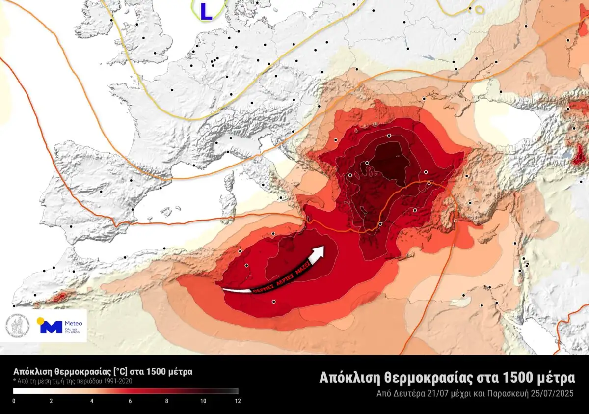 Οπως αναφέρει το meteo.gr η ατμοσφαιρική κυκλοφορία πάνω από την Ευρώπη, θα ευνοήσει τη μεταφορά πολύ θερμών αερίων μαζών από την Αφρική προς τα Βαλκάνια και τη χώρα μας, με αποτέλεσμα τις πολύ υψηλές θερμοκρασίες, αρχής γενομένης από τη Δευτέρα 21/07 και τουλάχιστον μέχρι και την Παρασκευή 25/07/2025.